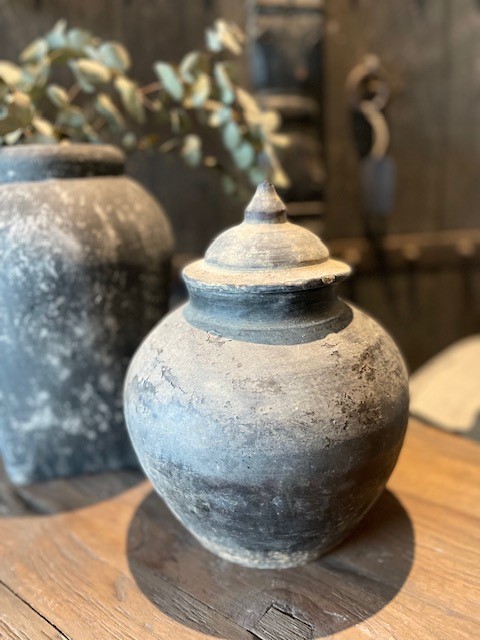 Oude, unieke stenen Chinese pot met deksel. Afm. H25cm x Ø20cm Afmetingen zijn bij benadering.