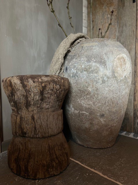 Unieke houten vijzel/kruk, ideaal als klein bijzettafeltje. Oud verweerde hout kleur. Afm. H45cm x Ø32cm Afmetingen zijn bij benadering. Dit artikel wordt niet verzonden en kan enkel worden afgehaald in onze gezellige woonwinkel.